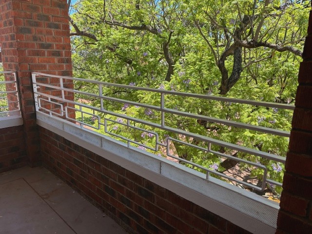 Custom-fabricated, powder-coated white steel guard rails. The design features a geometric rectangular pattern, specifically engineered for installation across the college's brick-pillared balconies and walkways.